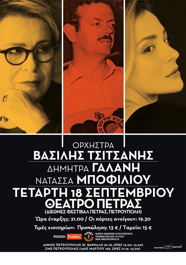 Τη Τετάρτη, 18 Σεπτεμβρίου, στην Πετρούπολη, η ΟΡΧΗΣΤΡΑ ΒΑΣΙΛΗΣ ΤΣΙΤΣΑΝΗΣ, με τη Δήμητρα Γαλάνη και τη Νατάσσα Μποφίλιου, αφού έδωσε παραστάσεις σε επιλεγμένα θέατρα της Ελλάδας και της Κύπρου, ολοκληρώνει τις εμφανίσεις της για το καλοκαίρι 2019 με μία βραδιά «μαγική , ονειρεμένη» που θα μας θυμίσει τον πλούτο της μουσικής του Βασίλη Τσιτσάνη.