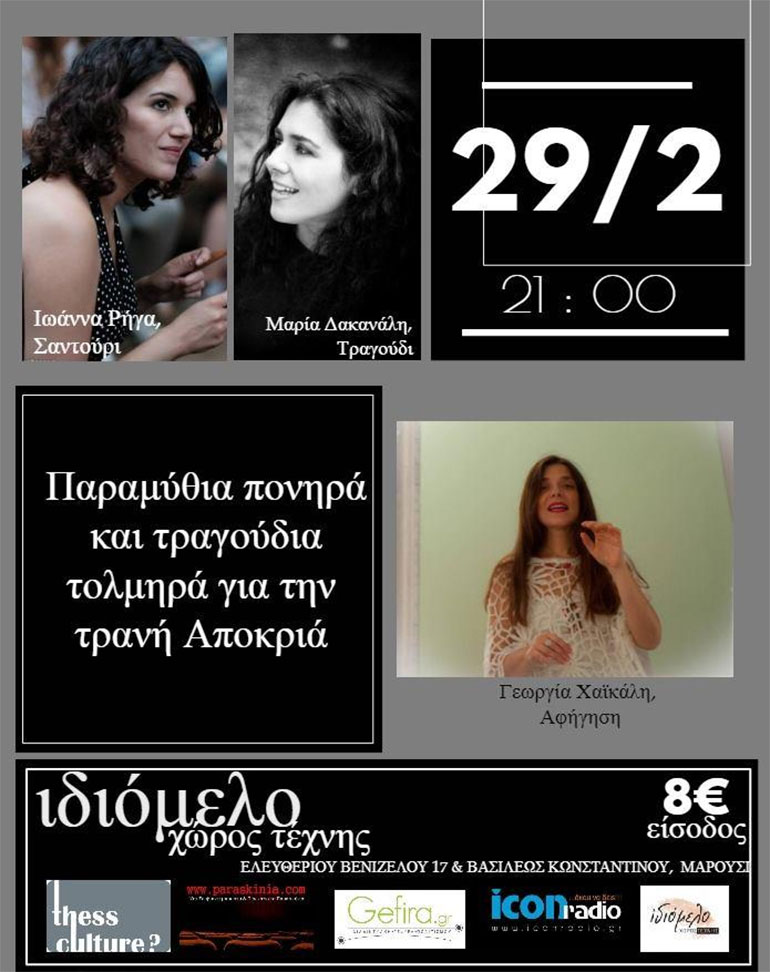 Με τη Γεωργία Χαϊκάλη στην αφήγηση, την Ιωάννα Ρήγα στο σαντούρι και τη Μαρίνα Δακανάλη στο τραγούδι.