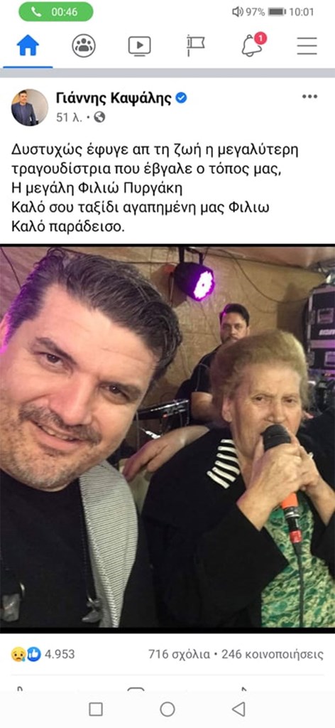 Την είδηση για τον θάνατό της, κοινοποίησε ο τραγουδιστής, Γιάννης Καψάλης με ανάρτησή του στο Facebook..