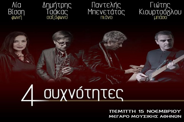 Τέσσερις μουσικοί στα μονοπάτια της ελληνικής και διεθνούς μουσικής. Η Λία Βίσση από το χώρο του έντεχνου τραγουδιού, ο Παντελής Μπενετάτος με δυναμικά τζαζ πλήκτρα, ο Δημήτρης Τσάκας με την απελευθερωτική πνοή του σαξοφώνου και ο Γιώτης Κιουρτσόγλου με την υπόγεια ενέργεια του μπάσου του μάς ταξιδεύουν στις μουσικές του κόσμου την Πέμπτη 15 Νοεμβρίου (Αίθουσα Banquet, 9:00 μ.μ.).