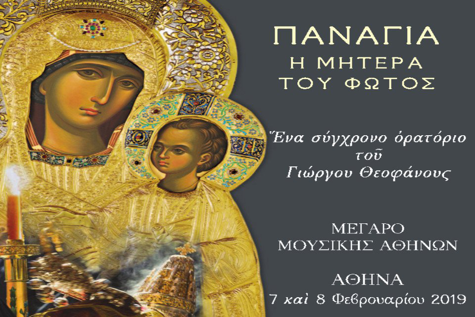Το ορατόριο ΠΑΝΑΓΙΑ-Η ΜΗΤΕΡΑ ΤΟΥ ΦΩΤΟΣ θα παρουσιαστεί σε δύο παραστάσεις στην αίθουσα «Αλεξάνδρα Τριάντη» του Μεγάρου Μουσικής Αθηνών στις 7 και 8 Φεβρουαρίου 2019. Ώρα έναρξης 8 μμ.