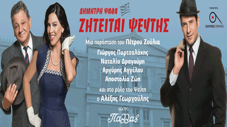 Η κορυφαία πολιτική και ιδιαίτερα προεκλογική και επίκαιρη κατά συνέπεια, σάτιρα του Δημήτρη Ψαθά “Ζητείται Ψεύτης” που έχει μεταφραστεί σε πέντε γλώσσες και αναφέρεται στις πελατειακές σχέσεις των πολιτικών με τους ψηφοφόρους τους, έρχεται στο Παλλάς.