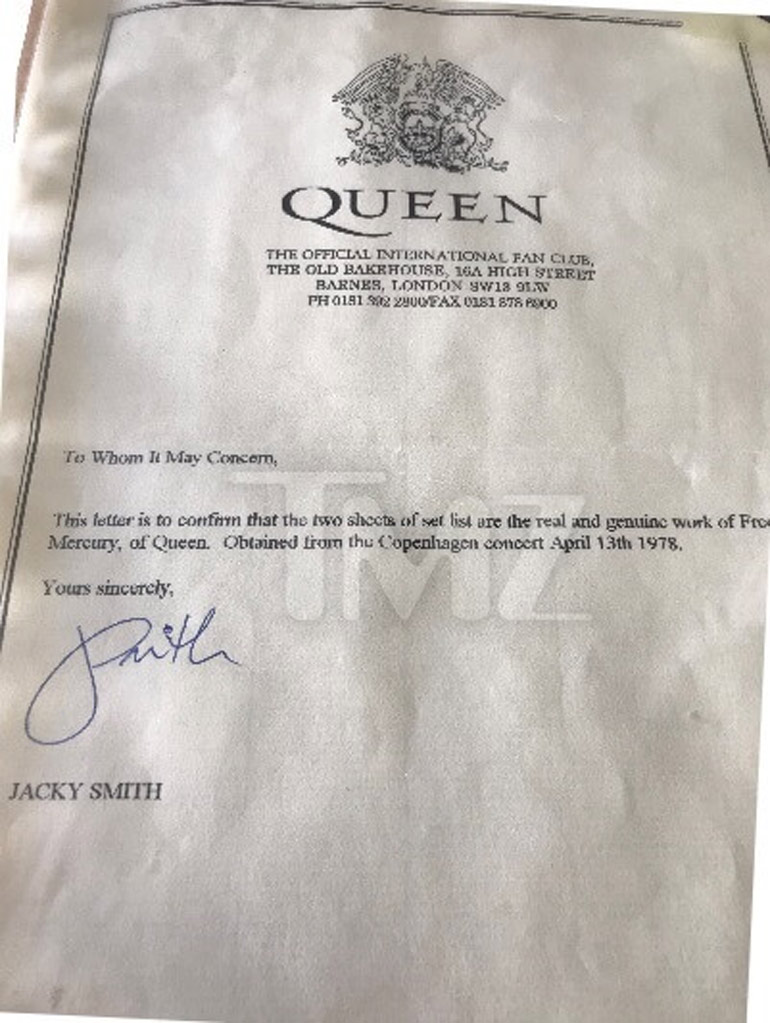 Η λίστα συνοδεύεται από επιστολή που πιστοποιεί την αυθεντικότητά της από το επίσημο fan club των Queen.