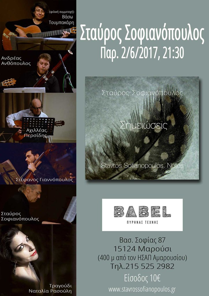 Ο μουσικοσυνθέτης και πιανίστας, Σταύρος Σοφιανόπουλος παρουσιάζει την Παρασκευή 2/6 /2017, στη Βαβέλ στο Μαρούσι, το νέο του cd καθώς και μουσικές από προηγούμενες δουλειές του.