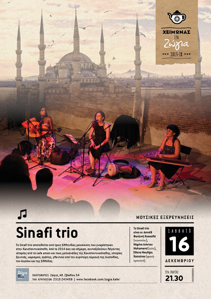 Το Sinafi Trio αποτελείται από την Ασινέθ Φωτεινή Κοκκαλά (κανονάκι), την Μαρίνα Λιόντου Mohamend (ούτι) και την Έλενα Μουδίρη Χασιώτου (φωνή – κρουστά). Η κοινή πορεία τους ξεκινά το 2014 στην Κωνσταντινούπολη και έκτοτε συνταξιδεύουν αφηγούμενες ιστορίες από την Ανατολία και την Ελλάδα.