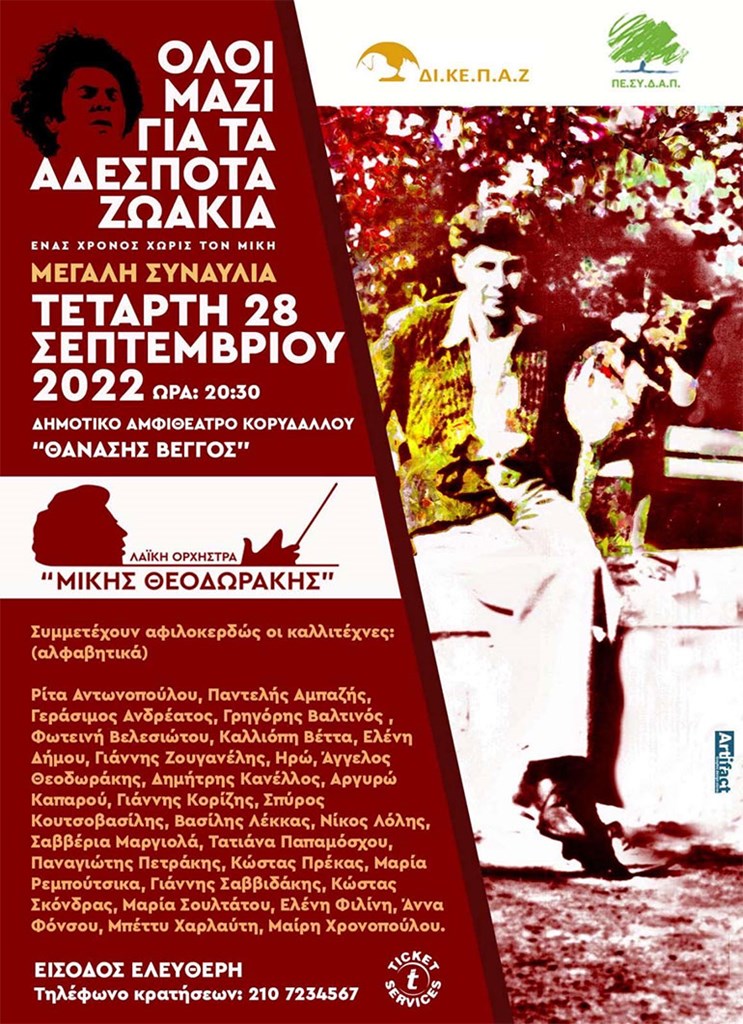 Η Λαϊκή Ορχήστρα που φέρει το όνομά του, συνεχίζοντας το έργο του και σ’ αυτόν τον τομέα, συμμετέχει αφιλοκερδώς στη μεγάλη συναυλία που οργανώνεται από το ΔΙΚΕΠΑΖ, με σκοπό την ενημέρωση και ευαισθητοποίηση όλων, αρμοδίων, φορέων και πολιτών για το θέμα των αδέσποτων.