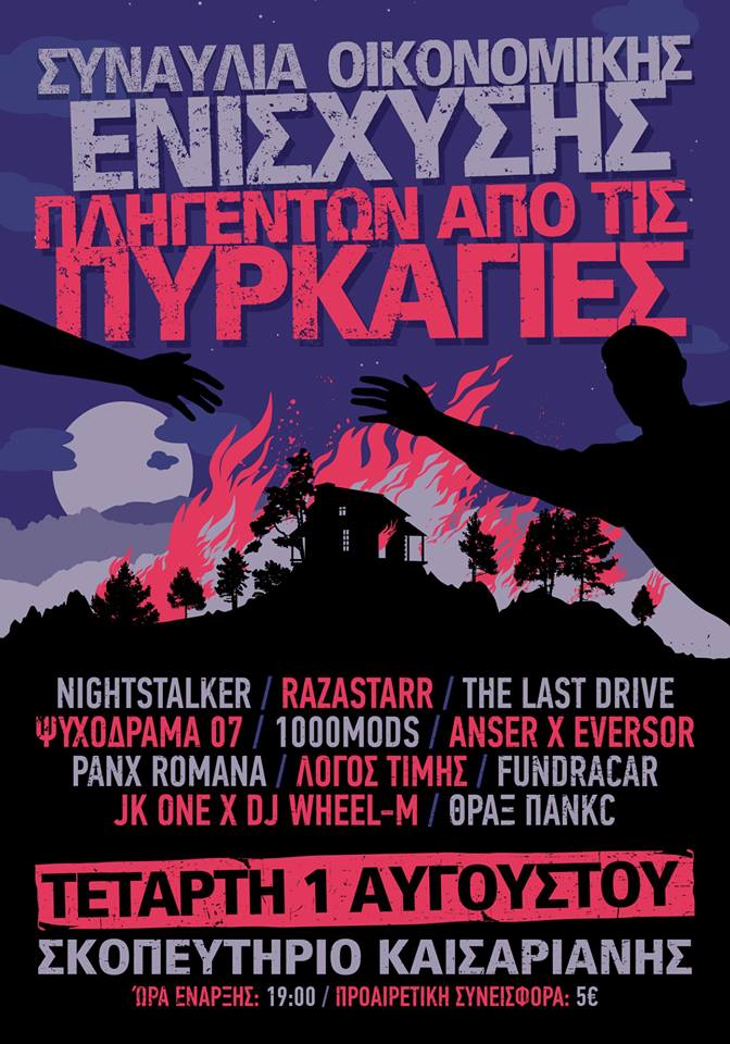 «Συγκλονισμένοι από την πρόσφατη τραγωδία που χτύπησε τους συνανθρώπους μας, έχοντας μαζί μας συλλογικότητες, δομές και δράσεις αλληλεγγύης από ολόκληρη την Αττική, δρούμε και κάνουμε το αυτονόητο: Βοηθάμε όσο και όπως μπορούμε, άμεσα, μέσω της ενασχόλησής μας, μέσω αυτού που ξέρουμε να κάνουμε: Τη διοργάνωση μουσικών εκδηλώσεων. Διοργανώνουμε μία μεγάλη συναυλία, με την αφιλοκερδή συμμετοχή γνωστών μουσικών της ελληνικής hip hop – rock – εναλλακτικής μουσικής σκηνής, καλών φίλων, κάποιοι εκ των οποίων έχουν και οι ίδιοι (ή συγγενικά τους πρόσωπα) πληγεί από τις πρόσφατες φονικές πυρκαγιές.Την Τετάρτη 1η Αυγούστου, στον ιστορικό χώρο του Σκοπευτηρίου Καισαριανής, συγκεντρώνουμε πόρους που θα διατεθούν ΑΠΕΥΘΕΙΑΣ στους πληγέντες (χωρίς τη διαμεσολάβηση κρατικών φορέων και μηχανισμών), διαδικασία της οποίας την διαφάνεια θα πιστοποιήσει νομικός. Σας περιμένουμε όλους σε αυτή τη μοναδική συγκυρία, για να δείξουμε την έμπρακτη συμπαράστασή μας στους αναξιοπαθούντες συμπολίτες μας», αναφέρεται στη σελίδα @forthevictimsoffire.