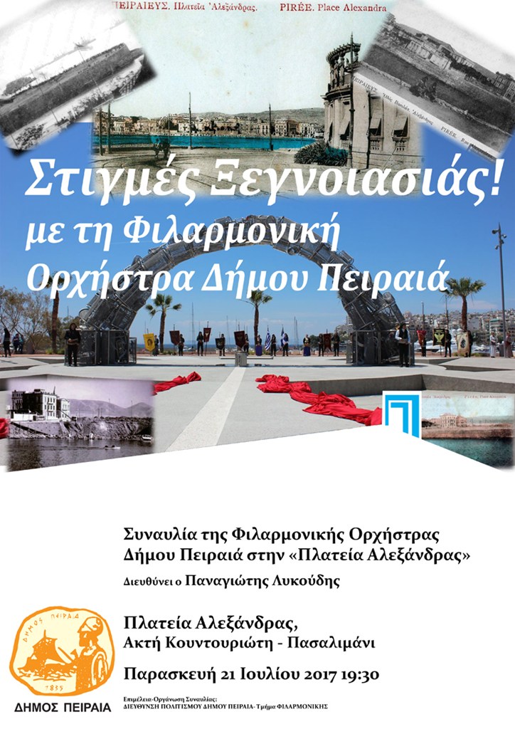 Με μελωδίες θα «πλημμυρίσει», η πλατεία Αλεξάνδρας, την Παρασκευή 21 Ιουλίου, στις 19.30, από τη Φιλαρμονική Ορχήστρα του Δήμου Πειραιά, στη συναυλία που θα δώσει υπό τη διεύθυνση του κ. Παναγιώτη Λυκούδη.