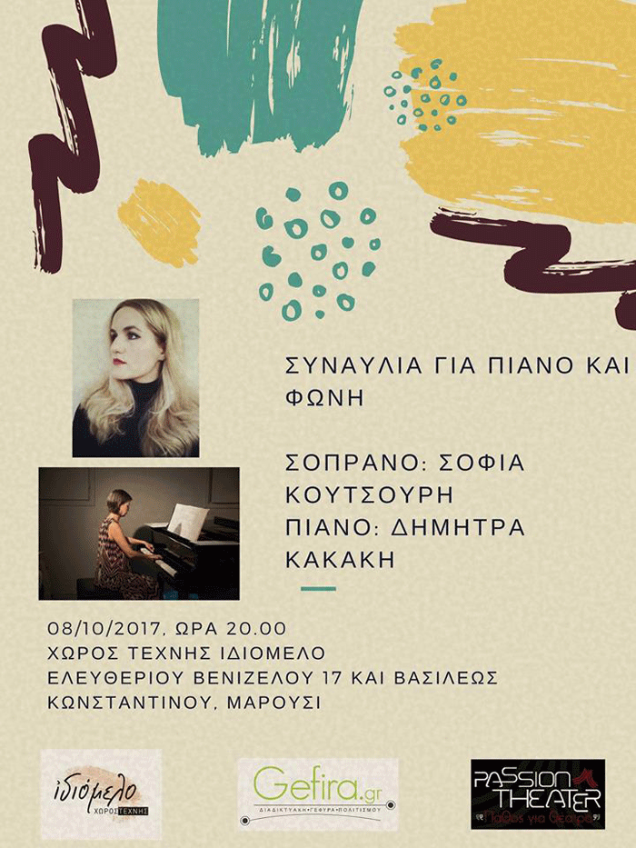 Την Κυριακή 8 Οκτωβρίου στον Χώρο Τέχνης Ιδιόμελο η σοπράνο Σοφία Κουτσούρη και η Δήμητρα Κακάκη στο πιάνο θα μας παρασύρουν σ’ ένα όμορφο μουσικό ταξίδι, μέσα από τις μουσικές εποχές: