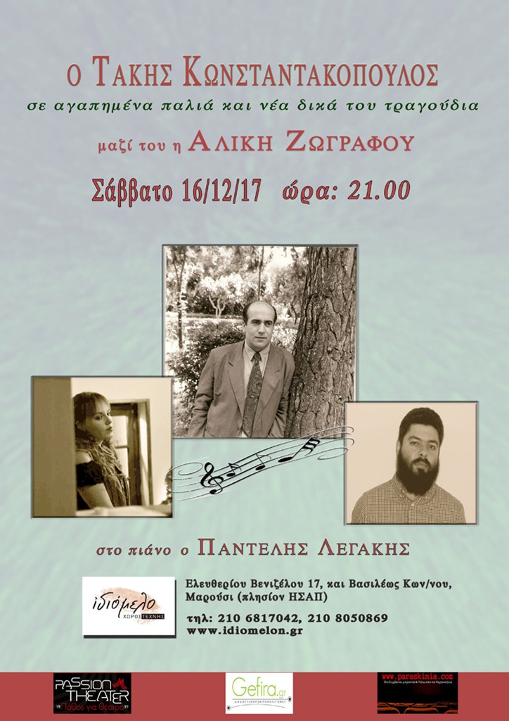 Το Σάββατο 16/12/17 ο Τάκης Κωνσταντακόπουλος έρχεται στο Ιδιόμελο, μαζί με την υπέροχη Αλίκη Ζωγράφου στο τραγούδι και τον Παντελή Λεγάκη στο πιάνο, να ερμηνεύσει αγαπημένα του γνωστά τραγούδια και έργα από την τελευταία του δισκογραφική δουλειά.