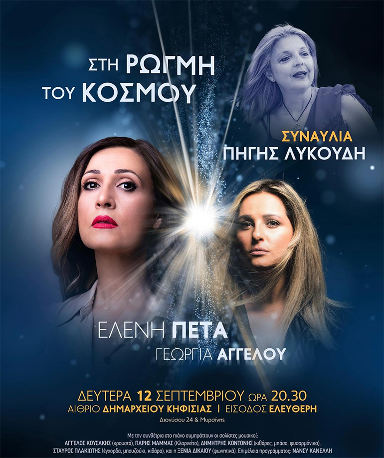Η γνωστή συνθέτρια Πηγή Λυκούδη δίνει πνοή στα λόγια των μεγάλων Ελλήνων ποιητών και η ερμηνεύτρια Ελένη Πέτα καταθέτει φωνή και ψυχή ώστε αυτά τα έργα να γίνουν ελπίδα και αχτίδα…Εκτός από τα έργα της ίδιας της συνθέτριας, θα ακουστούν τραγούδια και άλλων γνωστών Ελλήνων συνθετών!