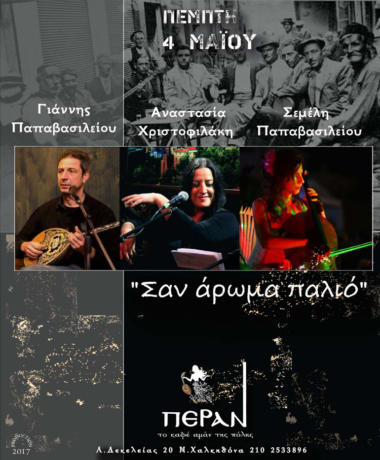 Αν τα τραγούδια έχουν άρωμα, αυτά που θα μας πουν η Αναστασία Χριστοφιλάκη, ο Γιάννης Παπαβασιλείου (Βλάχος) και η Σεμέλη Παπαβασιλείου, την Πέμπτη 4 Μαΐου, στις δέκα και μισή το βράδυ, στο «Πέραν, το καφέ αμάν της πόλης», μυρίζουν γαζία και γιασεμί, σαν αρώματα παλιά, που έχουν σημαδέψει ανεξίτηλα μνήμες και ζωές με τον ίδιο τρόπο που έχουν χαραχτεί στις καρδιές μας εκείνες οι παλιές μελωδίες… Σα να έχουν «ξεπηδήσει» από παλιό γραμμόφωνο, δρόμοι και ήχοι παντρεύονται σε ένα πρόγραμμα με ανατολίτικα, ρεμπέτικα, αρχοντορεμπέτικα και παλιά λαϊκά τραγούδια, που θα μας ταξιδέψει νοσταλγικά πίσω στο χρόνο…