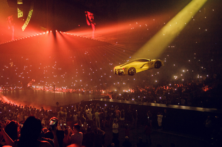 Ένα γιγάντιο drone σήκωσε μια κίτρινη Φεράρι (όχι αληθινή) στον αέρα (ήταν η πρώτη φορά που ο Γουίλο δοκίμασε κάτι τέτοιο σε κλειστό χώρο). Μια ψηφιακή οθόνη ήταν τοποθετημένη στο δάπεδο πάνω στη σκηνή και προέβαλε βίντεο καθ’ όλη τη διάρκεια της συναυλίας: από έναν τρισδιάστατο σκορπιό σ’ ένα κουτί – έμμεση αναφορά στο «Scorpion», το τελευταίο άλμπουμ του Drake το οποίο κυκλοφόρησε τον περασμένο Ιούνιο – μέχρις ένα επίπεδο από πάγο, στο οποίο με αισθητήρες που παρακολουθούσαν την κίνηση του ράπερ δημιουργούνταν ρωγμές. Διακόσια επιπλέον drones επιστρατεύθηκαν ως επιπρόσθετος φωτισμός και δημιουργούσαν χορογραφημένους σχηματισμούς (ανάμεσα σ’ αυτούς κι ένας τεράστιος περιστρεφόμενος σταυρός). Κάθε τραγούδι στο show συνοδευόταν από βίντεο που είχε ετοιμάσει ο Περόν, από απλά βιντεοκλίπ που έδειχναν λάβα να κοχλάζει μέχρις ένα τρισδιάστατο χέρι να αναδύεται αργά από το δάπεδο.