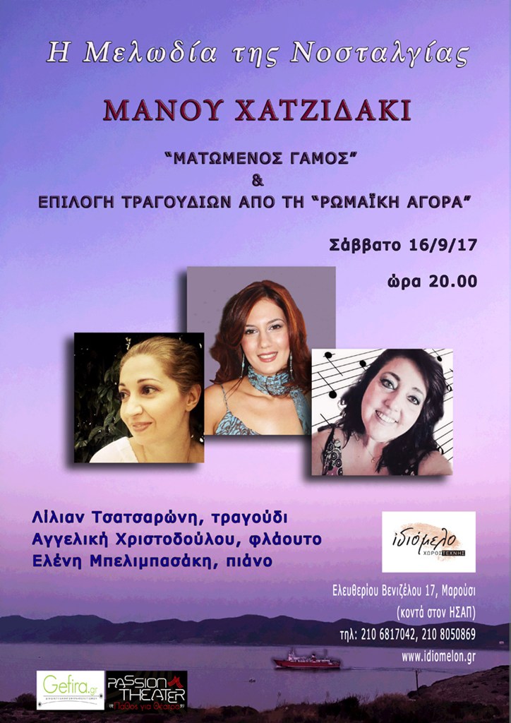Το Σάββατο 16 Σεπτεμβρίου 2017, το Ιδιόμελο ξεκινά για μια ακόμα χρονιά το ταξίδι του στην τέχνη και τον πολιτισμό. Η αρχή γίνεται εφέτος με έργα του Μάνου Χατζιδάκι. Οδηγοί σε αυτό το εναρκτήριο ταξίδι, τρεις ταλαντούχες κυρίες, η μεσόφωνος Λίλιαν Τσατσαρώνη, που θα ερμηνεύσει τον Ματωμένο Γάμο και μια επιλογή τραγουδιών από τη «Ρωμαϊκή Αγορά», η φλαουτίστα Αγγελική Χριστοδούλου και η συνθέτις και πιανίστα Ελένη Μπελιμπασάκη, η οποία έχει την καλλιτεχνική επιμέλεια της συναυλίας. Μαζί θα μας ταξιδέψουν στη «Μελωδία της Νοσταλγίας»…