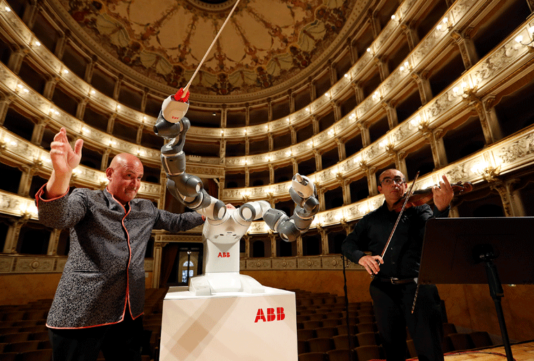 Το ανθρωποειδές ρομπότ YuMi σήκωσε την μπαγκέτα του και διηύθυνε τη Φιλαρμονική Ορχήστρα Lucca με τον Ιταλό τενόρο Αντρέα Μποτσέλι να ερμηνεύει γνωστές μελωδίες.