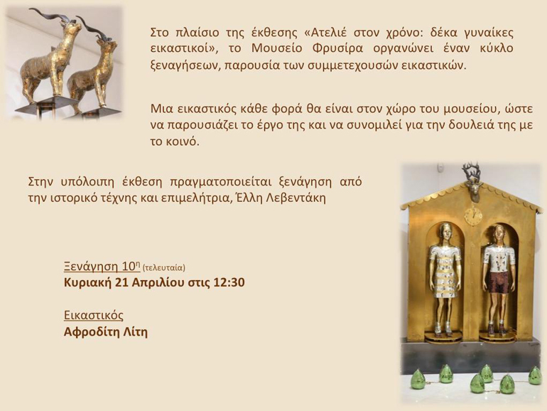 Την Κυριακή 21 Απριλίου είναι η τελευταία μέρα της έκθεσης «Ατελιέ στον Χρόνο: Δέκα Γυναίκες Εικαστικοί» στο Μουσείο Φρυσίρα με την εικαστικό Αφροδίτη Λίτη