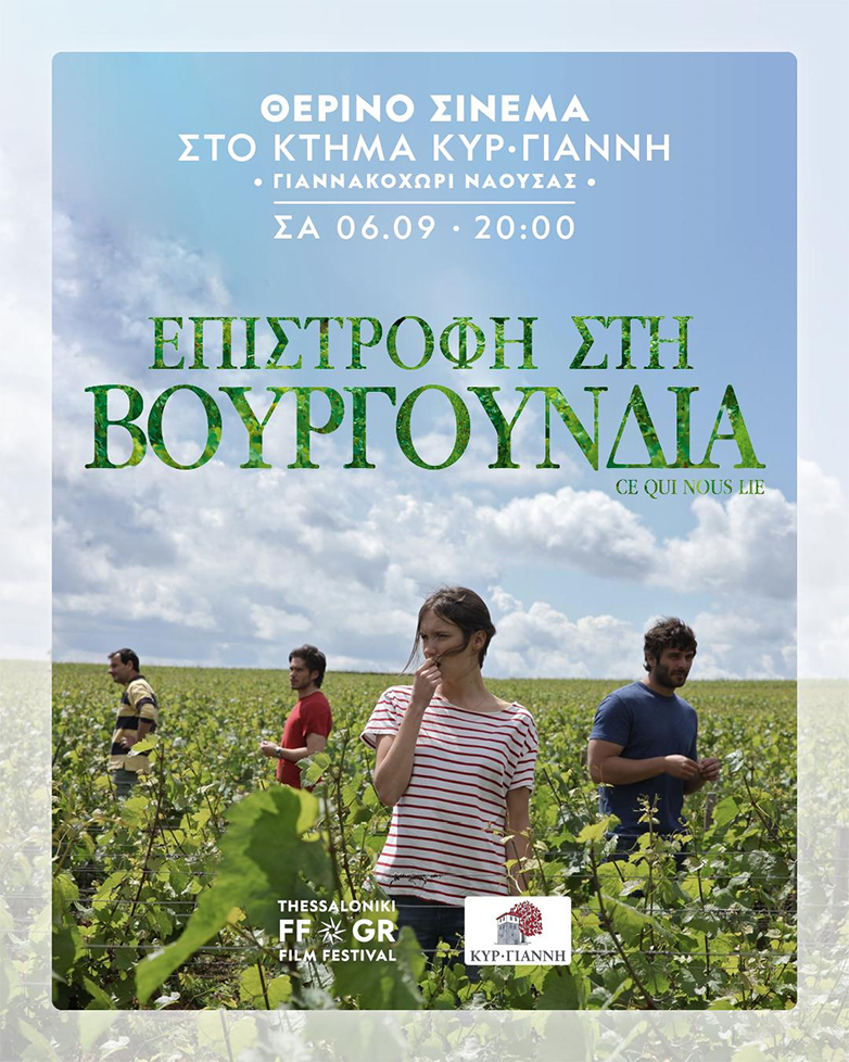 Σαν βγαλμένο από ταινία θα είναι το σκηνικό που θα στηθεί το πρώτο Σάββατο του Σεπτέμβρη στο κτήμα Κυρ-Γιάννη, στη Νάουσα. Παραμονή της πανσελήνου, ανάμεσα στα κλήματα του αμπελώνα, θα στηθεί ένα αλλιώτικο θερινό σινεμά. Με ένα ποτήρι κρασί στο χέρι και διάφορα σνακς, το κοινό θα απολαύσει μία τρυφερή ταινία σχετική με το κρασί. Την αξέχαστη εμπειρία για τους λάτρεις του κρασιού και του σινεμά, θα προσφέρουν το Κτήμα Κυρ – Γιάννη και το Φεστιβάλ Κινηματογράφου Θεσσαλονίκης.
