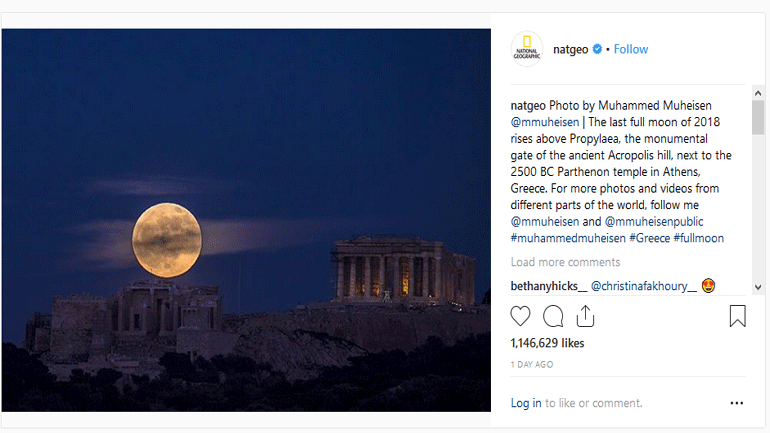 Μεγάλη απήχηση είχε η φωτογραφία του Ισραηλινού φωτορεπόρτερ Muhammed Muheisen στον λογαριασμό του National Geographic στο instagam που κατέγραφε τον Ιερό Βράχο της Ακρόπολης λουσμένο από το φώς της Πανσελήνου.