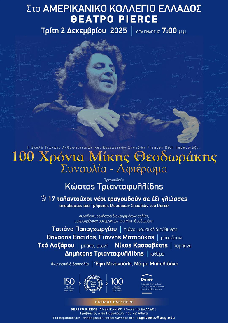 Το κοινό θα έχει την ευκαιρία να παρακολουθήσει σε μια ξεχωριστή συναυλία περισσότερους από 17 νέους από έντεκα χώρες και τέσσερις ηπείρους (Ευρώπη, Ασία, Αυστραλία, Αμερική), φοιτητές του Μουσικού Τμήματος του Deree,οι οποίοι θα τραγουδήσουν τραγούδια του Μίκη Θεοδωράκη σε 6 γλώσσες, τιμώντας τα 100 χρόνια του μεγάλου δημιουργού και τον παγκόσμιο θρίαμβο του έργου του. Ο Μίκης Θεοδωράκης βραβεύτηκε με τον τίτλο του Επίτιμου Διδάκτορα από το Αμερικανικό Κολλέγιο της Ελλάδος το 2009 σε τελετή που έγινε στο κατάμεστο Στάδιο Ειρήνης και Φιλίας, ενώ παραβρέθηκε και το 2016 στην αποφοίτηση του εγγονού του.