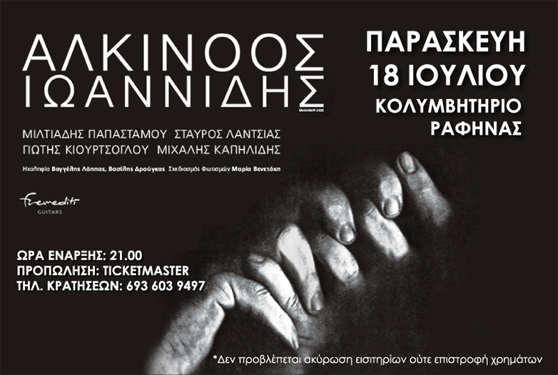 Πέρασαν ήδη πέντε χρόνια από την επανένωση της ιστορικής μπάντας του Αλκίνοου Ιωαννίδη η οποία αποτέλεσε ένα μεγάλο καλλιτεχνικό γεγονός. Είκοσι πέντε χρόνια μετά τις πρώτες τους κοινές εμφανίσεις και της ηχογράφησης του live άλμπουμ «Εκτός Τόπου και Χρόνου», οι σπουδαίοι μουσικοί συνεχίζουν και αυτό το καλοκαίρι τις εμφανίσεις τους, με μια συναυλία στο Δημοτικό Κολυμβητήριο Ραφήνας, την Παρασκευή 18 Ιουλίου.