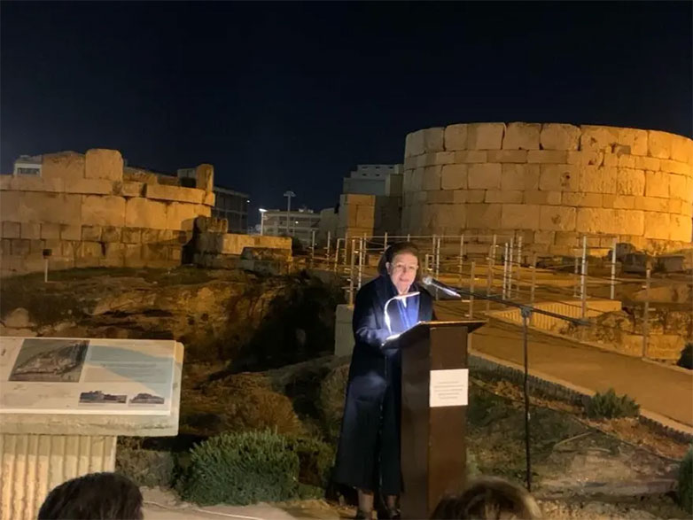 Η Λίνα Μενδώνη στον χαιρετισμό της επεσήμανε ότι «Τα θεμιστόκλεια τείχη του λιμένος του Πειραιά, μέρος των οποίων είναι και η Ηετιώνεια Πύλη, αποτελούν ένα από τα σημαντικότερα έργα της αρχαίας ελληνικής οχυρωματικής. Εδώ, μπορεί να αναγνωρίσει κανείς τις οχυρωματικές τεχνικές που αναπτύχθηκαν από τον 5ο έως τον 3ο αι. π.Χ. Είναι πολύ σημαντικό το εξαιρετικό αυτό έργο να το βλέπουν σωστά φωτισμένο και να απολαμβάνουν οι δημότες, οι επισκέπτες, οι επιβαίνοντες στα καράβια, που φθάνουν στο μεγάλο λιμάνι.Η συζήτηση για την ανάδειξη του αρχαιολογικού χώρου της Ηετιώνειας Πύλης- του μεγαλύτερου αρχαιολογικού χώρου της Πειραϊκής, έκτασης 20 στρεμμάτων, που παραχωρήθηκαν από τον ΟΛΠ στο ΥΠΠΟ- ξεκίνησε το 2010. Τελικά, το 2013, υπεγράφη Προγραμματική Σύμβαση Πολιτισμικής Ανάπτυξης μεταξύ του Υπουργείου Πολιτισμού και της Περιφέρειας Αττικής με αντικείμενο τον φωτισμό της Πύλης και των καταλοίπων του Αφροδισίου, που βρίσκονται εντός του χώρου. Η υλοποίησή της σύμβασης ξεκίνησε το 2013 και σήμερα ολοκληρώνεται όλη η παρέμβαση με τον φωτισμό της Πύλης και αναβαθμίζεται η ευρύτερη περιοχή.Ο αρχαιολογικός χώρος εντάσσεται στον αστικό ιστό, συνδέει το παρελθόν με το παρόν, αναδεικνύει τη μεγάλη ιστορική διαχρονία του λιμανιού του Πειραιά και καθορίζει μια νέα αστική ταυτότητα στην πόλη και το παραλιακό της μέτωπο, καθώς σε επαφή με τον αρχαιολογικό χώρο βρίσκεται το «Καστράκι» Δραπετσώνας, ένα δημοτικό πάρκο, που προγραμματίζεται να φιλοξενεί ένα πολυμορφικό πλέγμα πολιτιστικών δράσεων και δραστηριοτήτων. Το έργο της ανάπλασης του αρχαιολογικού χώρου της Ηετιώνειας Πύλης, ας το δούμε ως προπομπό και σε άμεση συνάρτηση με το μείζον έργο της μετατροπής του Σιλό -αυτού του εμβληματικού κτηρίου για τον Πειραιά, ακριβώς απέναντι από την Πύλη- σε Μουσείο Εναλίων Αρχαιοτήτων. Το Μουσείο αυτό έρχεται να καλύψει ένα μεγάλο κενό. Στην πατρίδα μας έχουμε πολλά και εξαιρετικά αρχαιολογικά μουσεία. Όμως στην Ελλάδα, με τα χιλιάδες χιλιόμετρα ακτών, με τα χιλιάδες μικρά και μεγάλα νησιά, με τη ναυτοσύνη και τη θάλασσα να έχουν καθοριστικό ρόλο όχι μόνον στην ιστορία και τον πολιτισμό της πατρίδας μας, αλλά και στην οικονομική και την κοινωνική της φυσιογνωμία, δεν υπάρχει ακόμη το μουσείο, στο οποίο διαχρονικά να προβάλλονται και να διδάσκονται οι θησαυροί που ανασύρονται από τις θάλασσες μας, ο ενάλιος πλούτος της χώρας μας. Πριν λίγες μέρες υπεγράφη η σύμβαση με τον ανάδοχο του έργου. Το Μουσείο Εναλίων Αρχαιοτήτων, συνολικού προϋπολογισμού περίπου 100.000.000 ευρώ από τους πόρους του Ταμείου Ανάκαμψης, προγραμματίζεται να ολοκληρωθεί στο τέλος του 2025. Με αυτή την ευκαιρία θα ήθελα να ευχαριστήσωτην άρτι αφυπηρετήσασα, από την Εφορεία Πειραιώς και Νήσων, Αγγελική Σίμωσι για το πολύτιμο έργο της και την πολύχρονη δημιουργική αφοσίωσή της, στην Υπηρεσία».