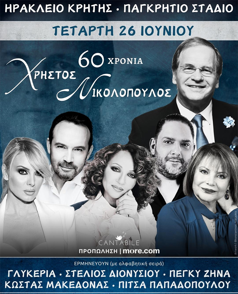 Ο Χρήστος Νικολόπουλος, συμπληρώνοντας 60 χρόνια ενεργής δράσης και προσφοράς στον πολιτισμό ταξιδεύει με το μπουζούκι του και αυτό το καλοκαίρι σε όλη την Ελλάδα! Έχοντας στο πλάι του τους κορυφαίους ερμηνευτές Γλυκερία, Στέλιο Διονυσίου, Πέγκυ Ζήνα, Κώστα Μακεδόνα και Πίτσα Παπαδοπούλου μας υπόσχεται μία αξέχαστη καλοκαιρινή συναυλία την Τετάρτη 26 Ιουνίου στο Παγκρήτιο στάδιο του Ηρακλείου Κρήτης με τα μοναδικά του διαχρονικά και κλασικά τραγούδια!