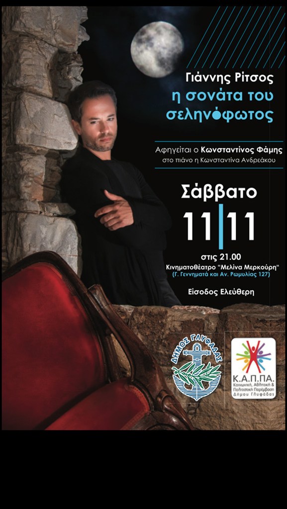 Με αφορμή την επέτειο θανάτου του Γιάννη Ρίτσου (11 Νοεμβρίου 1990), ο Δήμος Γλυφάδας τιμά τον σπουδαίο Έλληνα ποιητή, παρουσιάζοντας τη «Σονάτα του σεληνόφωτος».