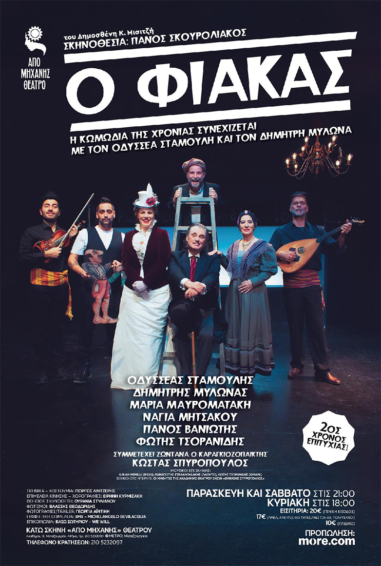 Μετά τη μεγάλη επιτυχία και τα συνεχόμενα sold out, η κωμωδία της χρονιάς «Ο Φιάκας» του Δημοσθένη Κ. Μισιτζή σε σκηνοθεσία Πάνου Σκουρολιάκου που μέχρι στιγμής την έχουν παρακολουθήσει πάνω από 10.000 θεατές, συνεχίζεται στο «Από Μηχανής» Θέατρο με τον Οδυσσέα Σταμούλη στο ρόλο του αξιαγάπητου απατεώνα Φιάκα και τον Δημήτρη Μυλωνά στο ρόλο του παμπόνηρου υπηρέτη του, Γιάννη.