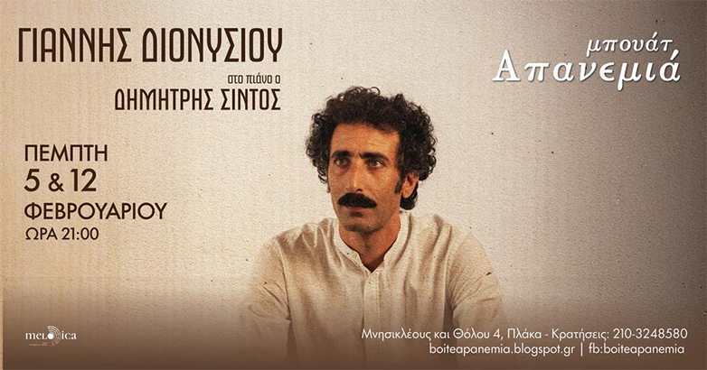Ο Γιάννης Διονυσίου μας προσκαλεί στην Μπουάτ Απανεμιά την Πέμπτη 5 και 12 Φεβρουαρίου. Μαζί του στο πιάνο ο Δημήτρης Σίντος.