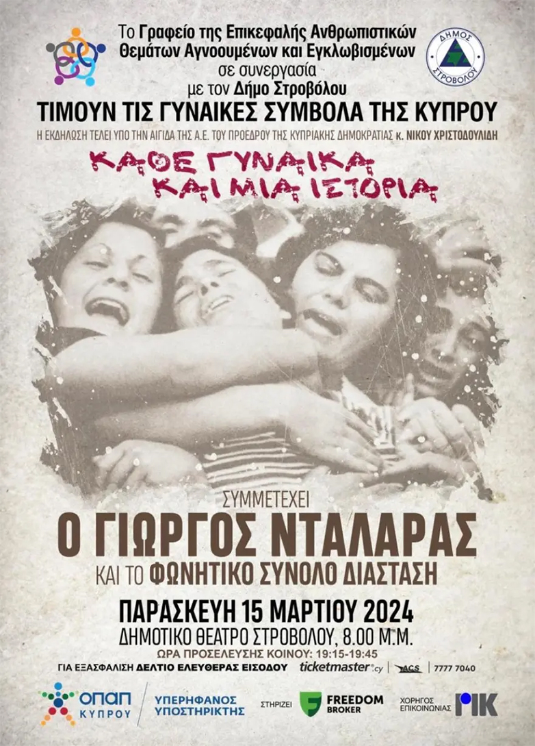 Ειδικότερα το Γραφείο της Επικεφαλής Ανθρωπιστικών Θεμάτων Αγνοουμένων και Εγκλωβισμένων της Προεδρίας της Δημοκρατίας σε συνεργασία με το Δήμο Στροβόλου, στο πλαίσιο των επετειακών εκδηλώσεων από τα 50 χρόνια της τουρκικής εισβολής του 1974, αλλά και επί της ευκαιρίας της Παγκόσμιας Ημέρας της Γυναίκας (8 Μαρτίου), διοργανώνουν εκδήλωση με τίτλο «Κάθε Γυναίκα και μια Ιστορία – Γυναίκες Σύμβολα της Κύπρου».