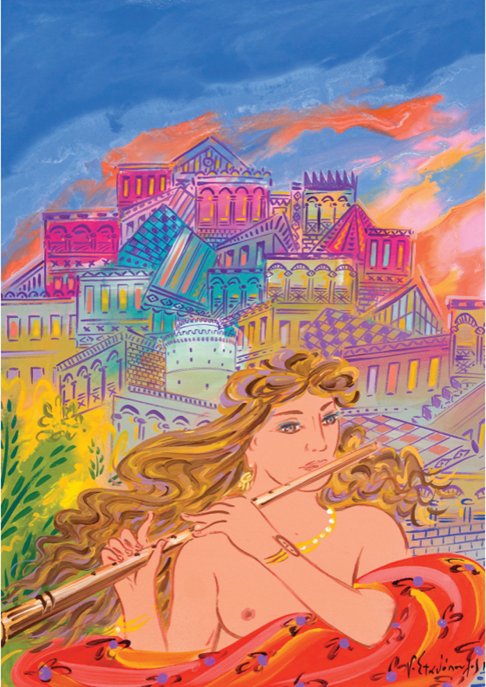 Το άλλο αγαπημένο θέμα στα έργα του ζωγράφου είναι η ιδανικά όμορφη, γυμνή χυμώδης γυναίκα η οποία ενσαρκώνει τη χαρά της ζωής. Αιώνια σύμβολα του Γιώργου Σταθόπουλου τα λευκά περιστέρια και τα μουσικά του όργανα, με την άρπα και τη φλογέρα να κυριαρχούν, προσθέτοντας ρομαντισμό και ονειρικές διαστάσεις.