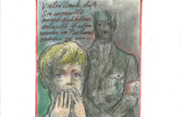 Στο τελευταίο του σκίτσο, ο εκκεντρικός σχεδιαστής παρουσιάζει τον Αδόλφο Χίτλερ να λέει στην Άνγκελα Μέρκελ: «Σε ευχαριστώ πολύ που επέτρεψες ακούσια στους απογόνους μου να εκπροσωπηθούν στο Κοινοβούλιο». Στο ίδιο σκίτσο απεικονίζεται η Γερμανίδα Καγκελάριος εμφανώς σκυθρωπή να διερωτάται: «Τι έχω κάνει»;