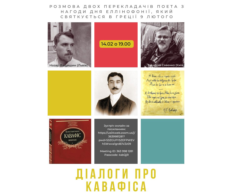 Η διαδικτυακή συνάντηση «Διάλογοι για τον Καβάφη» θα πραγματοποιηθεί διαδικτυακά στην ουκρανική γλώσσα, στις 14 Φεβρουαρίου, ώρα 19.00, στον σύνδεσμο zoom: https://us04web.zoom.us/j/3639981281