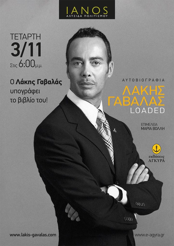 Ο Λάκης Γαβαλάς υπογράφει την αυτοβιογραφία του με τίτλο «Λάκης Γαβαλάς, Loaded», που κυκλοφορεί από τις εκδόσεις Άγκυρα, στον Ιανό της Θεσσαλονίκης, την Τετάρτη 3 Νοεμβρίου, 18:00-20:00.