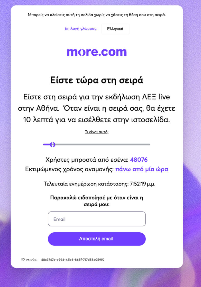 Εισερχόμενος κάποιος στην ιστοσελίδα more.com για τη συναυλία βρίσκεται το απόγευμα της Πέμπτης σε «ουρά» σχεδόν 50.000 χρηστών, με τον εκτιμώμενο χρόνο αναμονής να ξεπερνά τη μία ώρα.
