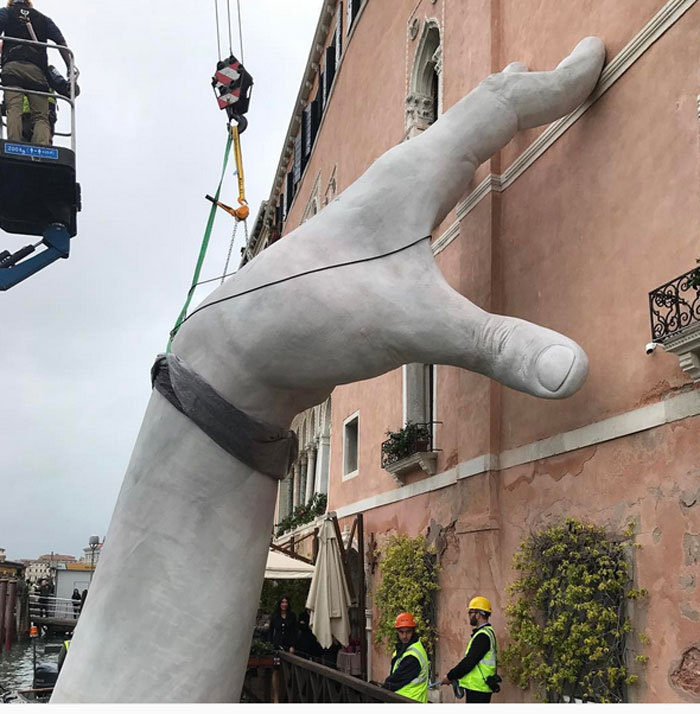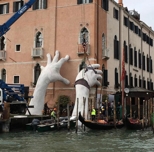 Η εγκατάσταση ενός μνημειώδους γλυπτού για την εφετινή Μπιενάλε της Βενετίας ολοκληρώθηκε. Δύο γιγαντιαία χέρια αναδύονται από τη λιμνοθάλασσα για να στηρίξουν τη μία από τις πλευρές του Ca’ Sagredo Hotel που βλέπουν στο κανάλι. Η «Υποστήριξη» είναι μια οπτικοποιημένη δήλωση του Lorenzo Quinn για τις επιπτώσεις στη Γαληνοτάτη της αλλαγής του κλίματος και της ανόδου της στάθμης του νερού.