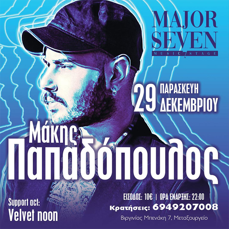 Ο Μάκης Παπαδόπουλος έρχεται για μία και μοναδική εμφάνιση την Παρασκευή 29 Δεκεμβρίου, στο Major Seven, μαζί με την μπάντα του και έχοντας στις αποσκευές του τραγούδια του πρώτου του δίσκου καθώς και φρέσκα που θα παρουσιαστούν για πρώτη φορά στο Αθηναϊκό κοινό.