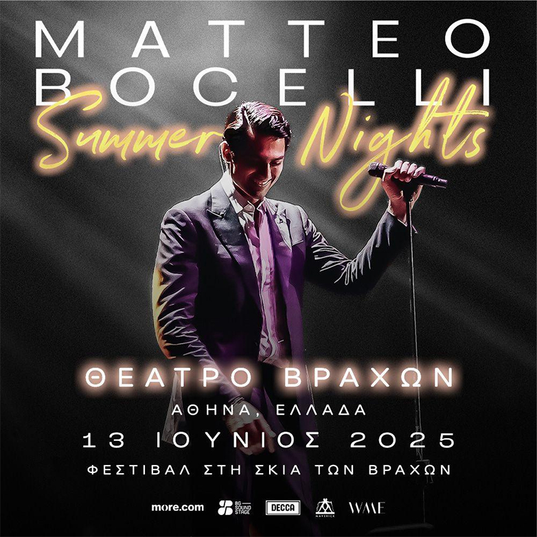 Μετά την περιοδεία του στη Βόρεια και Νότια Αμερική, ο Matteo Bocelli ξεκινά μια νέα, ακόμη μεγαλύτερη ευρωπαϊκή περιοδεία, η οποία περιλαμβάνει και μια αποκλειστική ημερομηνία για την Αθήνα, στις 13/06/2025 στο Θέατρο Βράχων Μελίνα Μερκούρη.