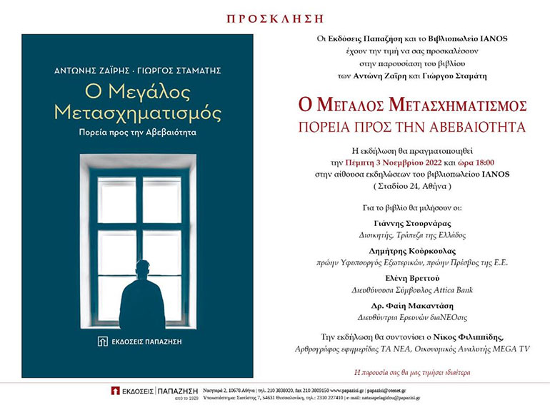 Οι εκδόσεις Παπαζήση και το βιβλιοπωλείο Ιανός παρουσιάζουν το βιβλίο των Αντώνη Ζαΐρη και Γιώργου Σταμάτη «Ο Μεγάλος Μετασχηματισμός – Πορεία προς την Αβεβαιότητα» την Πέμπτη 3 Νοεμβρίου 2022, ώρα 18.00, στην αίθουσα εκδηλώσεων του βιβλιοπωλείου Ιανός (Σταδίου 24, Αθήνα).