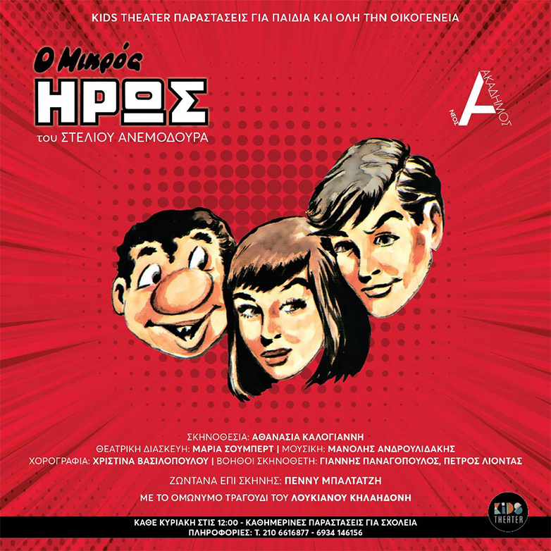 Το θρυλικό ανάγνωσμα του Στέλιου Ανεμοδουρά «Μικρός Ήρως» ζωντανεύει στη σκηνή από την Αθανασία Καλογιάννη και το Kids Theater τη θεατρική περίοδο 2024 – 25. O γενναίος Γιώργος Θαλάσσης, το κορίτσι – φάντασμα Κατερίνα και ο σπαρταριστός Σπίθας μεταφέρουν μικρούς και μεγάλους στην εποχή της εθνικής αντίστασης κατά της γερμανικής κατοχής μέσα από μία ιστορία που αγαπήθηκε από γενιές και γενιές. Σε ένα «σήμερα» γεμάτο συγκρούσεις, πολέμους και αδικία, ο Μικρός Ήρως, επίκαιρος όσο ποτέ, έρχεται να δώσει τον γενναίο αγώνα για την ελευθερία και το δίκαιο και να εμπνεύσει αισιοδοξία για το αύριο.