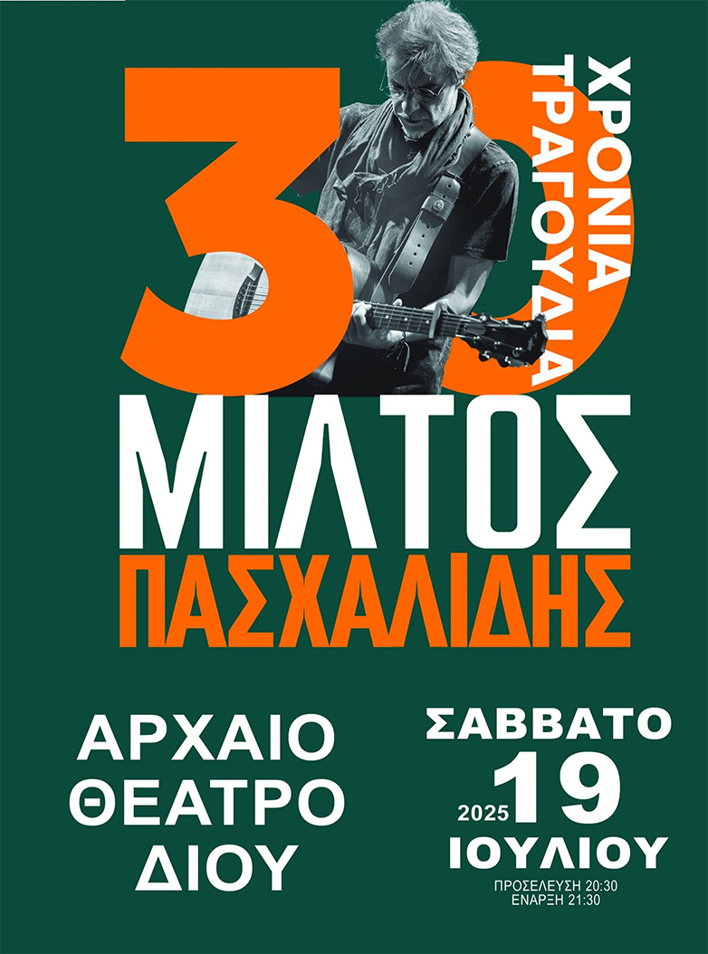 Φέτος ο Μίλτος κλείνει τριάντα χρόνια προσωπικής δισκογραφίας, και τα γιορτάζει μαζί μας στο Αρχαίο Θέατρο Δίου το Σάββατο 19 Ιουλίου 2025.