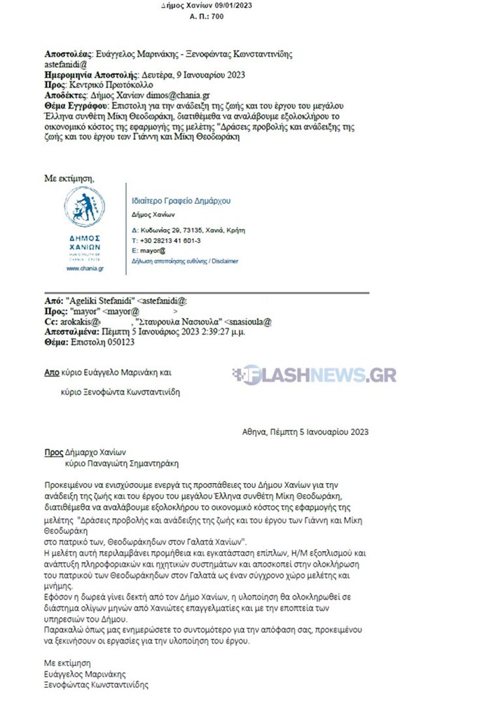 Δείτε και τη σχετική επιστολή από τους κ.κ. Μαρινάκη και Κωνσταντινίδη προς το Δήμο Χανιών:
