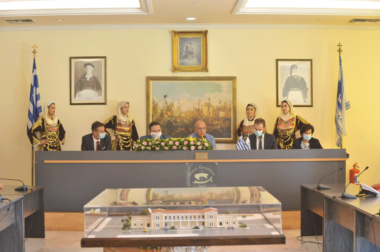 Τέλος, ο κ. Αμράνι, ο κ. Μαριδάκης, ο δήμαρχος της Σαλαμίνας, αλλά και η πολιτική και στρατιωτική ηγεσία κατέθεσαν στεφάνι στον Τύμβο των Σαλαμινομάχων.