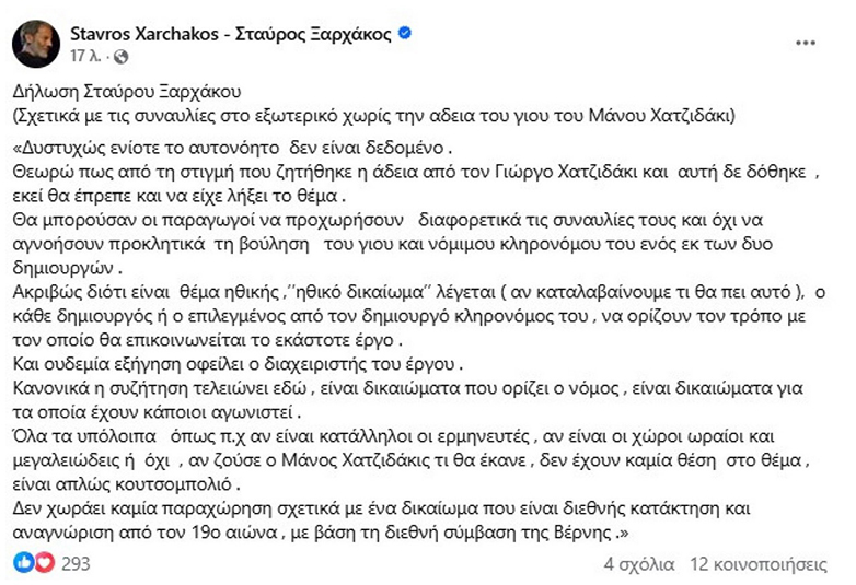 Στην παρέμβασή του, ο Σταύρος Ξαρχάκος τονίζει ότι οι διοργανωτές αγνόησαν προκλητικά τη βούληση του κληρονόμου, υπογραμμίζοντας ότι το θέμα είναι πρωτίστως ζήτημα ηθικής τάξης και δικαιωμάτων των δημιουργών, ενώ χαρακτήρισε τα υπόλοιπα ως απλά «κουτσομπολιά».