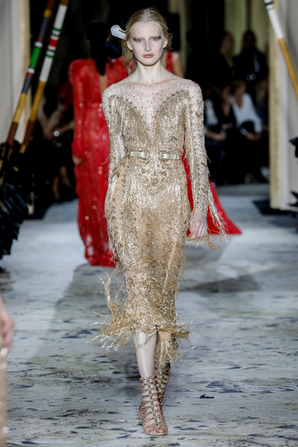 Εκτός από τα φτερά στα μαλλιά των μοντέλων, η πασαρέλα ήταν διακοσμημένη με βαμμένες ράβδους και από τις δύο πλευρές, που θύμιζαν εκείνες που χρησιμοποιούνται στις παραδοσιακές teepees σκηνές. Ορισμένα φορέματα είχαν επίσης μοτίβα σαφώς εμπνευσμένα από τις ινδιάνικες φυλές.