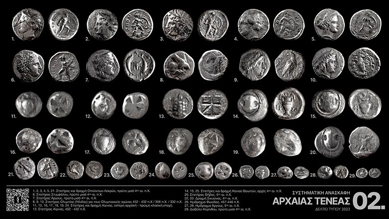 Πρόκειται για 29 αργυρά αρχαία ελληνικά νομίσματα, που χρονολογούνται από τον ύστερο 6ο αι. π.Χ. μέχρι περίπου τα μέσα του 4ου αι. π.Χ., πολλά από τα οποία θεωρούνται από τα σπανιότερα και πλέον ιστορικά νομίσματα της αρχαίας Ελλάδας. «Στον θησαυρό αυτό έχουμε σπάνια νομίσματα, πολύ σπάνια και εξαιρετικά σπάνια», λέει στο ΑΠΕ-ΜΠΕ ο δρ Κωνσταντίνος Λαγός, ιστορικός-νομισματολόγος, συνεργάτης του ερευνητικού προγράμματος, ο οποίος μας παρουσιάζει κάποια από τα νομίσματα του θησαυρού που εντοπίστηκε στις ανασκαφές του περασμένου Οκτωβρίου, χωρίς αυτό να σημαίνει ότι και τα υπόλοιπα υπολείπονται σημασίας.
