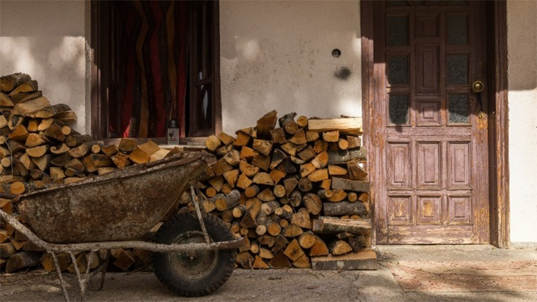 Από μακριά διακρίνεται η φιγούρα ενός άνδρα που στοιβάζει επιμελώς τα ξύλα στο σιδερένιο καρότσι για να τα μεταφέρει ένα ένα στις αποθήκες και τα υπόστεγα του σπιτιού του, δημιουργώντας έναν επιπλέον στιβαρό ξυλόχτιστο τοίχο.
