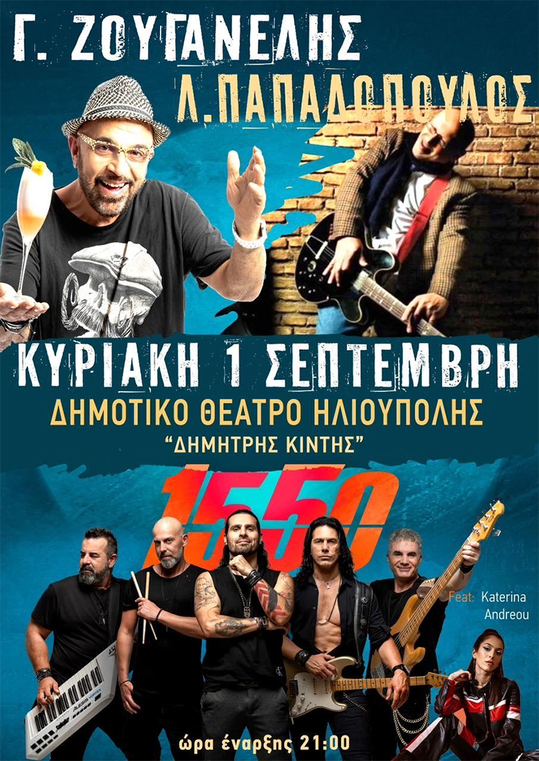 Οι 15 50, ο Γιάννης Ζουγανέλης και ο Λάκης Παπαδόπουλος σε μια μοναδική συναυλία απόψε (Κυριακή 1η Σεπτεμβρίου) στο ανοιχτό θέατρο «Δημήτρης Κιντής» στο φεστιβάλ Ηλιούπολης.