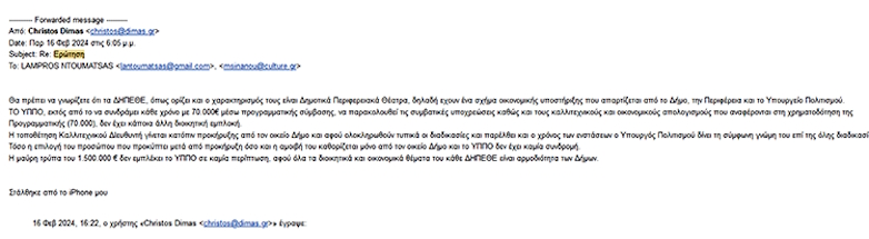 Η μαύρη τρύπα του 1.500.000 € δεν εμπλέκει το ΥΠΠΟ σε καμία περίπτωση, αφού όλα τα διοικητικά και οικονομικά θέματα του κάθε ΔΗΠΕΘΕ είναι αρμοδιότητα των Δήμων».