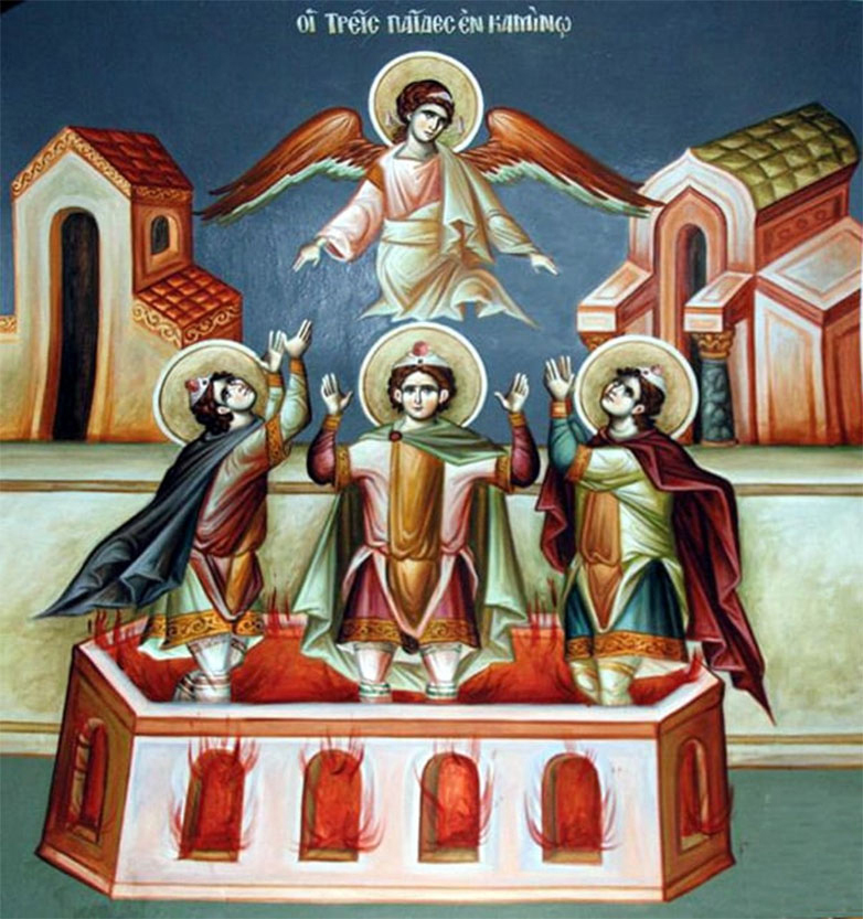 Οι Τρεις Παίδες εν Καμίνω, οι οποίοι προέρχονται από την Παλαιά Διαθήκη, ήταν τρία εβραιόπουλα, ο Ανανίας, ο Αζαρίας και ο Μισαήλ, που κατάγονταν από βασιλικό γένος και ζούσαν στα Ιεροσόλυμα. Όταν η πόλη τους κυριεύτηκε από τον βασιλιά των Βαβυλωνίων, Ναβουχοδονόσορα Β’ τον Μέγα (634-562 π.Χ), τα τρία παιδιά σύρθηκαν αιχμάλωτα στη Βαβυλώνα μαζί με τον φίλο τους Δανιήλ, τον μετέπειτα προφήτη. Εκεί ξεχώρισαν για τη φρόνηση και την αρετή τους και ο βασιλιάς τους διόρισε επιστάτες στην Αυλή του.